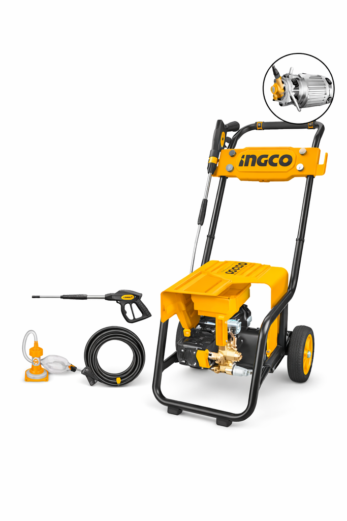 The INGCO HPWR30018 2400W High Pressure Washer is a heavy-duty professional cleaning machine built for car detailing studios, workshops, farms, and commercial use. Powered by a copper wire induction motor and copper pump, it ensures durability, strong performance, and long service life (up to 500 hours rated usage).