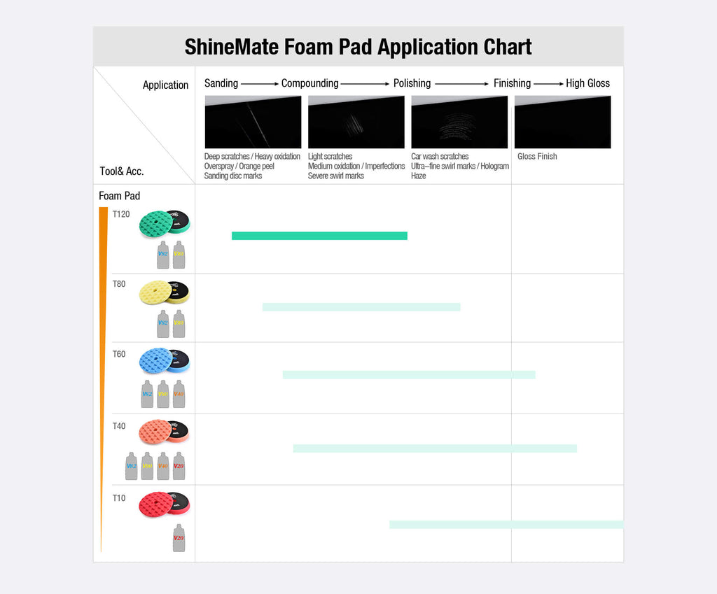 Green T120 heavy cut foam is in solid construction, it fast removes the deep scratches, over spray, 1200/1500# sanding disc marks, and heavy oxidation.