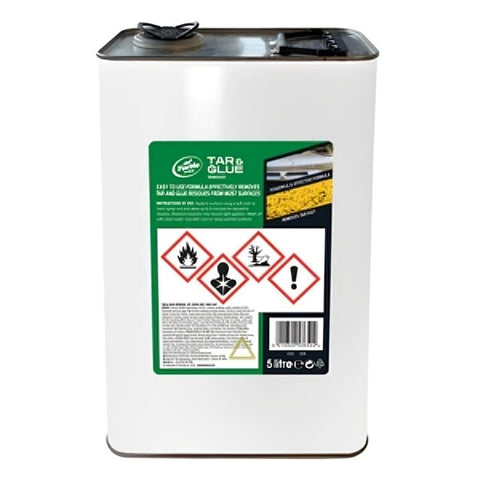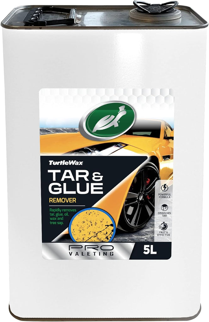 Turtle Wax Pro Tar & Glue Remover effectively removes tar, glue, and other strong adhesives. Its concentrated formula quickly penetrates and breaks down tough residues. This 5L size is ideal for industrial or automotive use, with enough product to remove stubborn residues from large areas and surfaces.