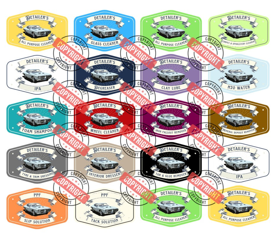 This set of 40 high-quality laminated vinyl stickers (2x each design) is specially crafted for spray bottles used in car care, auto detailing, and workshop environments. The waterproof and chemical-resistant lamination ensures your labels stay clear and intact, even with regular handling and exposure to detailing products.